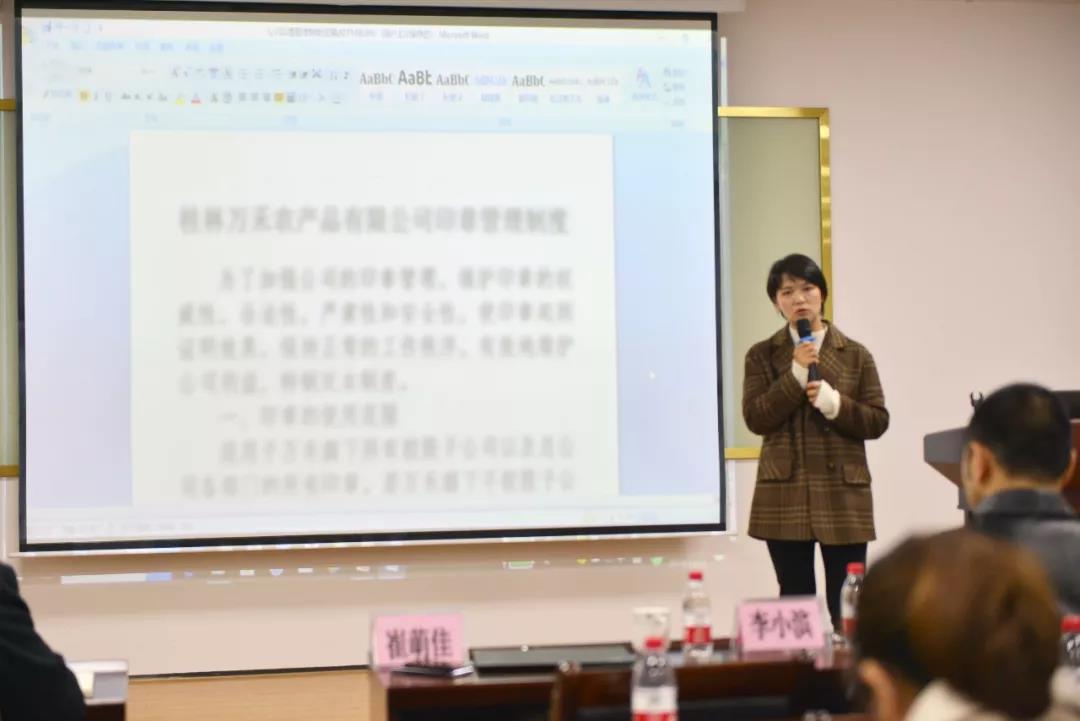 為確保公司印章使用的安全性和嚴(yán)謹(jǐn)性,加強(qiáng)公司門禁系統(tǒng)及會(huì)務(wù)工作管理,12月24日下午,萬禾公司組織各部門及各子公司的負(fù)責(zé)人、主管及相關(guān)員工在萬禾黨建館培訓(xùn)室就《印章管理制度》、《門禁系統(tǒng)管理辦法》及《會(huì)議室使用及會(huì)務(wù)工作管理辦法》舉辦培訓(xùn)并召開印章授權(quán)會(huì),共有50余人參加會(huì)議。