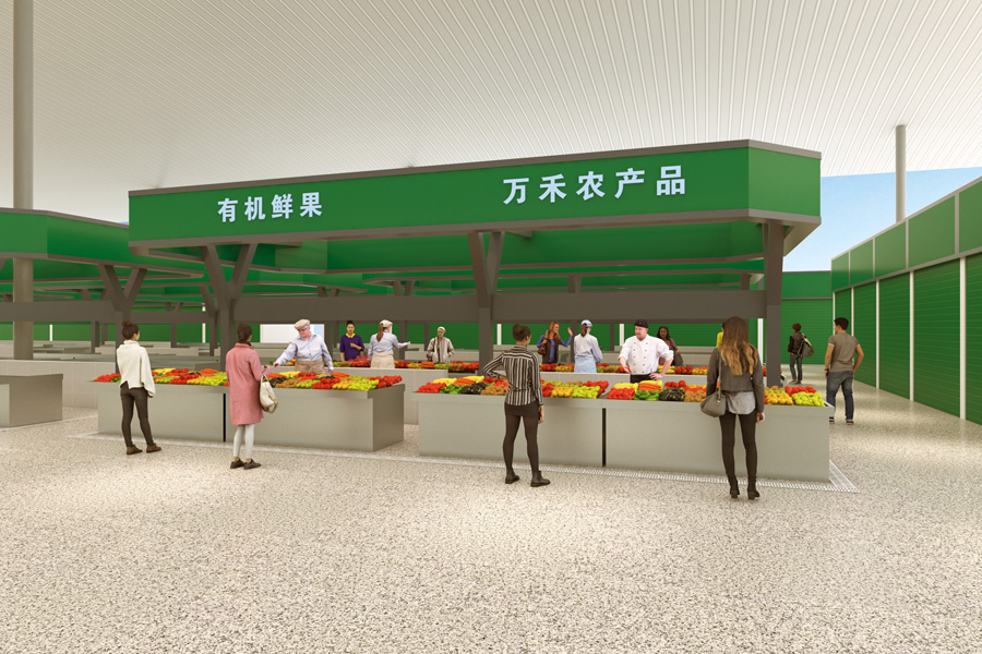 為解決周邊流動(dòng)攤販的經(jīng)營(yíng)問題,市場(chǎng)設(shè)立大型集市 區(qū)、夜市區(qū)及餐飲區(qū),規(guī)劃近千商位,可安置過千個(gè) 就業(yè)崗位,為服務(wù)區(qū)內(nèi)的城市配送公司提供一站式采 購(gòu)平臺(tái)。