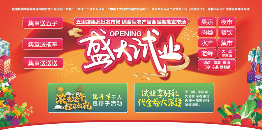 五里店果蔬批發(fā)市場(chǎng)——綜合型農(nóng)產(chǎn)品全品類批發(fā)市場(chǎng)期間試業(yè)歡迎廣大市民朋友前來市場(chǎng)消費(fèi),完成相應(yīng)集章數(shù)量,即可獲端午佳節(jié)五子好禮以及非常實(shí)用美觀的購(gòu)物拖車。