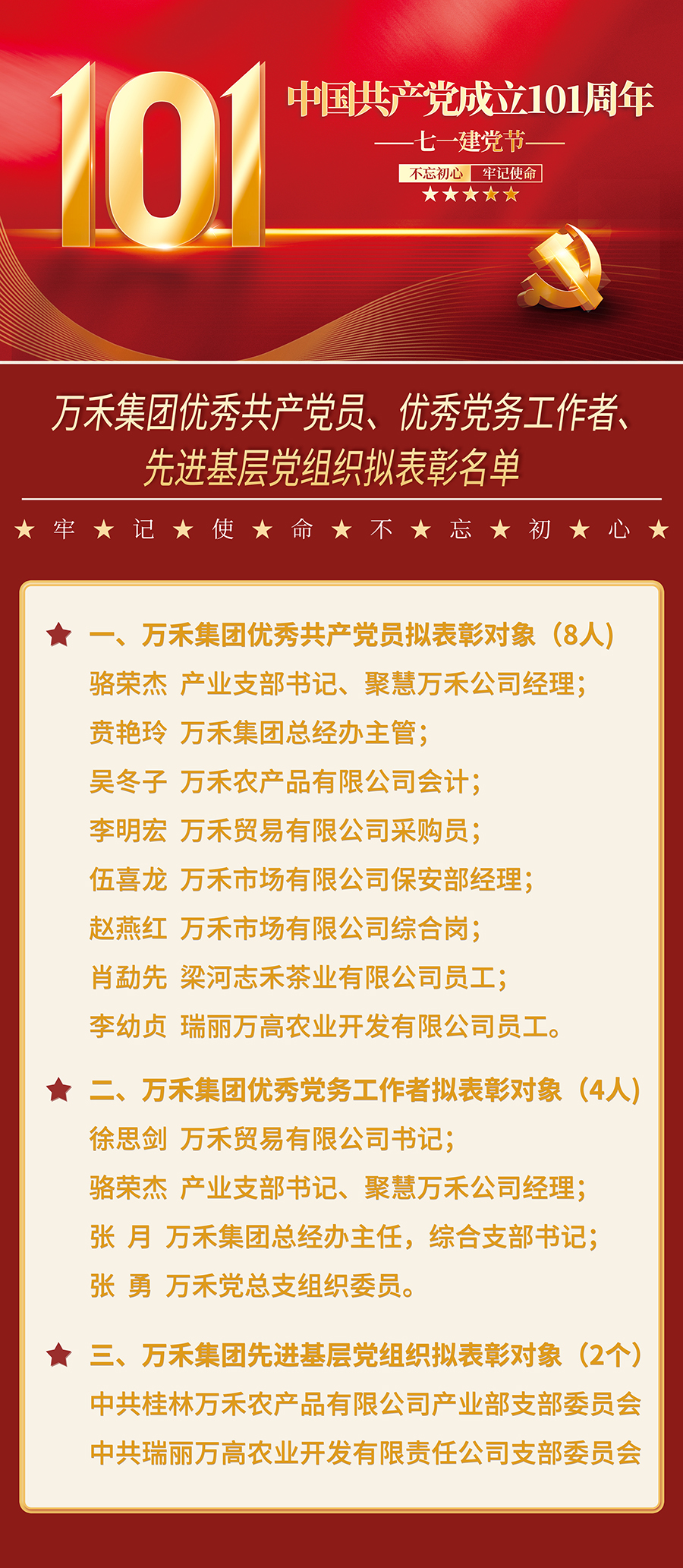 今年是中國共產(chǎn)黨成立101周年。黨總支決定,表彰一批公司優(yōu)秀共產(chǎn)黨員、優(yōu)秀黨務(wù)工作者和先進基層黨組織。根據(jù)評選表彰工作部署,在公司各支部提出推薦對象的基礎(chǔ)上,經(jīng)認(rèn)真審核、遴選審議,確定了駱榮杰等8名同志為公司優(yōu)秀共產(chǎn)黨員、徐思劍等4名同志為公司優(yōu)秀黨務(wù)工作者、中共桂林萬禾農(nóng)產(chǎn)品有限公司產(chǎn)業(yè)部支部委員會2個基層黨組織為公司先進基層黨組織擬表彰對象。
