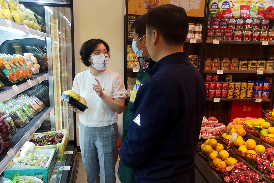 ▲檢查水果品牌標(biāo)識(shí)是否合格