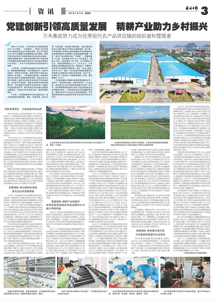 黨的十八大以來(lái),廣西萬(wàn)禾農(nóng)業(yè)開(kāi)發(fā)集團(tuán)有限公司(以下簡(jiǎn)稱:“萬(wàn)禾集團(tuán)”)堅(jiān)持以習(xí)近平新時(shí)代中國(guó)特色社會(huì)主義思想為指導(dǎo),深入學(xué)習(xí)貫徹習(xí)近平總書記重要講話和重要指示批示精神,聚焦于現(xiàn)代農(nóng)業(yè)和農(nóng)產(chǎn)品商貿(mào)物流行業(yè)的多元化領(lǐng)域,黨建引領(lǐng)統(tǒng)籌布局,實(shí)現(xiàn)區(qū)域內(nèi)現(xiàn)代農(nóng)產(chǎn)品供應(yīng)鏈產(chǎn)業(yè)集聚區(qū)的建設(shè)經(jīng)營(yíng)與現(xiàn)代農(nóng)產(chǎn)品標(biāo)準(zhǔn)化種植與產(chǎn)業(yè)化推廣,為農(nóng)產(chǎn)品流通和供應(yīng)提供強(qiáng)有力保障。