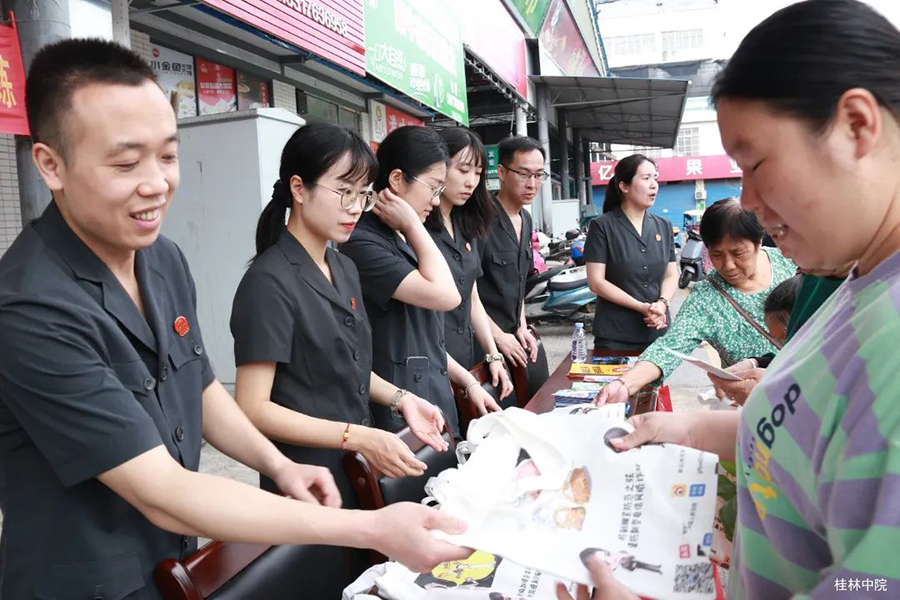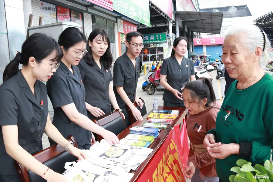 隨后,桂林中院、七星法院組織青年干警志愿者與萬禾集團黨員代表及青年員工來到五里店果蔬批發(fā)市場,面向市場的商戶、顧客進行法律宣傳,現(xiàn)場解答群眾法律問題,提供法律咨詢,發(fā)放掃黑除惡、防范電信網(wǎng)絡(luò)詐騙等方面的法律宣傳資料。