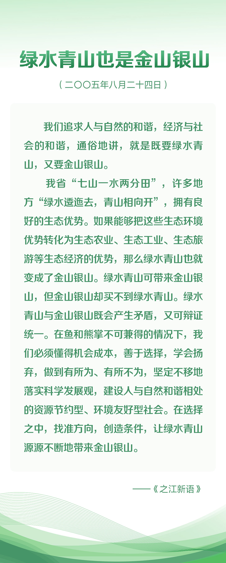 考察結(jié)束后,習(xí)近平在浙江日報《之江新語》專欄發(fā)表了《綠水青山也是金山銀山》一文。