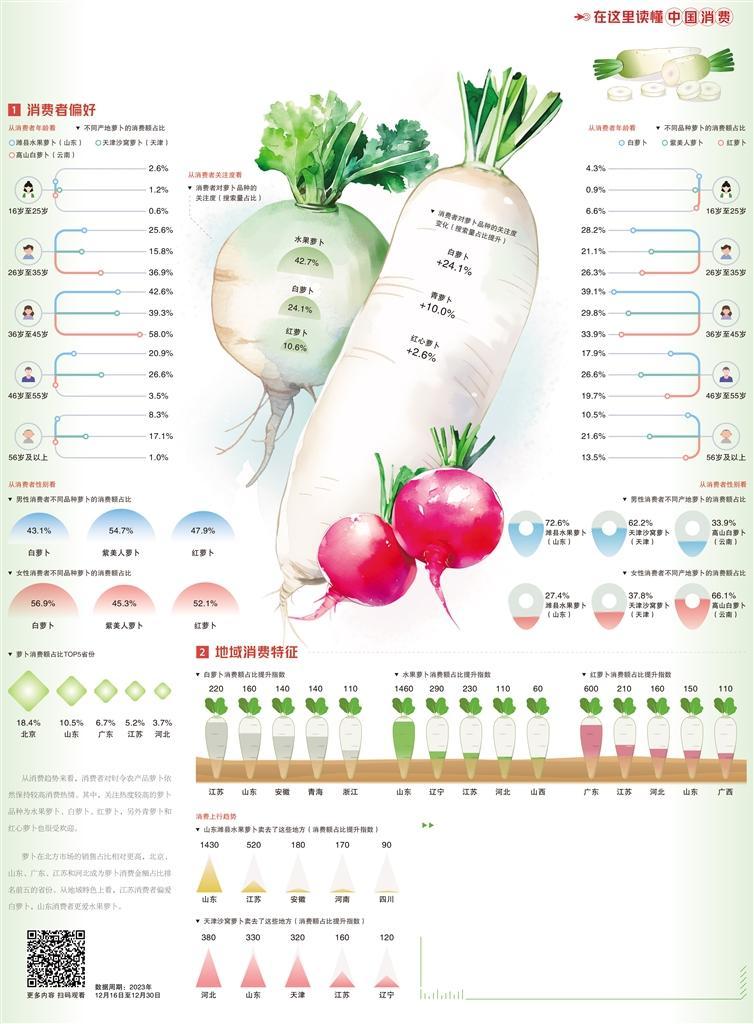 從線上銷售趨勢來看,水果蘿卜、白蘿卜、紅蘿卜、青蘿卜和紅心蘿卜等產(chǎn)品的熱度最高。今冬蔬菜價(jià)格偏低,雖然蘿卜是“大路菜”,但有了地理標(biāo)志“金名片”加持,也能獲得不錯(cuò)的銷售反響。數(shù)據(jù)顯示,地標(biāo)農(nóng)產(chǎn)品天津沙窩蘿卜、山東濰縣水果蘿卜等廣受消費(fèi)者歡迎。