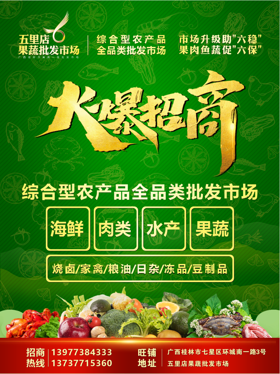 桂林五里店綜合農(nóng)產(chǎn)品批發(fā)市場(chǎng)目前開放果蔬區(qū)、海鮮區(qū)、水產(chǎn)區(qū)、肉類區(qū)、燒鹵區(qū)、家禽區(qū)、日雜區(qū)、凍品區(qū)、豆制品區(qū)、糧油區(qū)10個(gè)業(yè)態(tài)批發(fā)類招商。