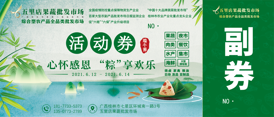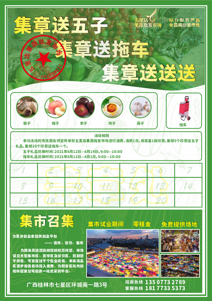 五里店果蔬批發(fā)市場(chǎng)——綜合型農(nóng)產(chǎn)品全品類批發(fā)市場(chǎng)期間試業(yè)歡迎廣大市民朋友前來市場(chǎng)消費(fèi),完成相應(yīng)集章數(shù)量,即可獲端午佳節(jié)五子好禮以及非常實(shí)用美觀的購(gòu)物拖車。