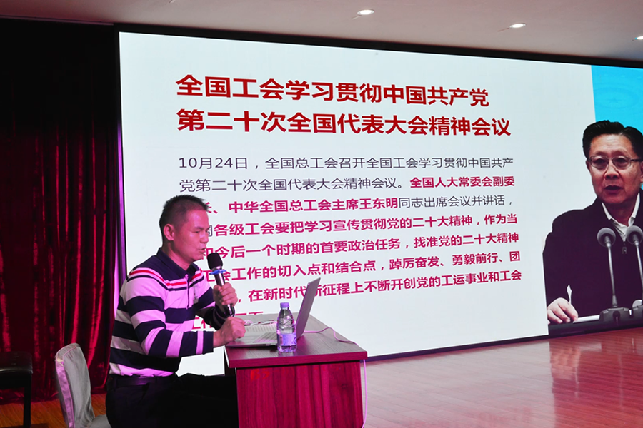 桂林市七星區(qū)總工會(huì)常務(wù)副主席陳國(guó)峰為貨運(yùn)司機(jī)帶來(lái)了暖心的春節(jié)禮盒、米等慰問(wèn)品,同時(shí),作了題為《深入學(xué)習(xí)貫徹黨的二十大精神,努力在新的偉大征程上開(kāi)創(chuàng)新就業(yè)形態(tài)勞動(dòng)者工會(huì)工作新局面——在貨車(chē)司機(jī)培訓(xùn)班上的輔導(dǎo)報(bào)告》的宣講。