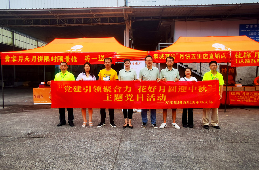 在中秋國慶雙節(jié)消費旺季期間,為促進提升桂林五里店果蔬批發(fā)市場的影響力和消費力,萬禾集團五里店市場支部于9月2日至10月6日在桂林五里店果蔬批發(fā)市場水產(chǎn)二區(qū)正門前設(shè)點打造月餅采買專區(qū),開展了以“黨建引領(lǐng)聚合力·花好月圓迎中秋”為主題的系列黨日活動,結(jié)合引進月餅品牌商家優(yōu)質(zhì)貨源、價格優(yōu)勢以及影響力等資源,進行品牌月餅集中展銷,聚集人氣營造濃厚的節(jié)日氛圍。